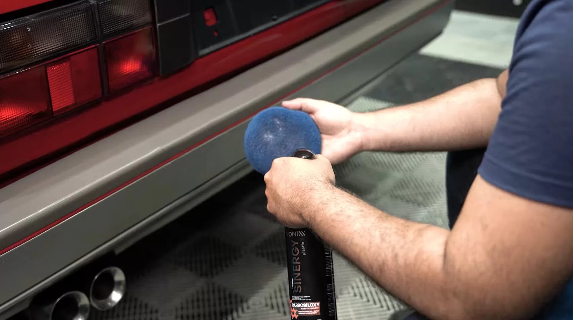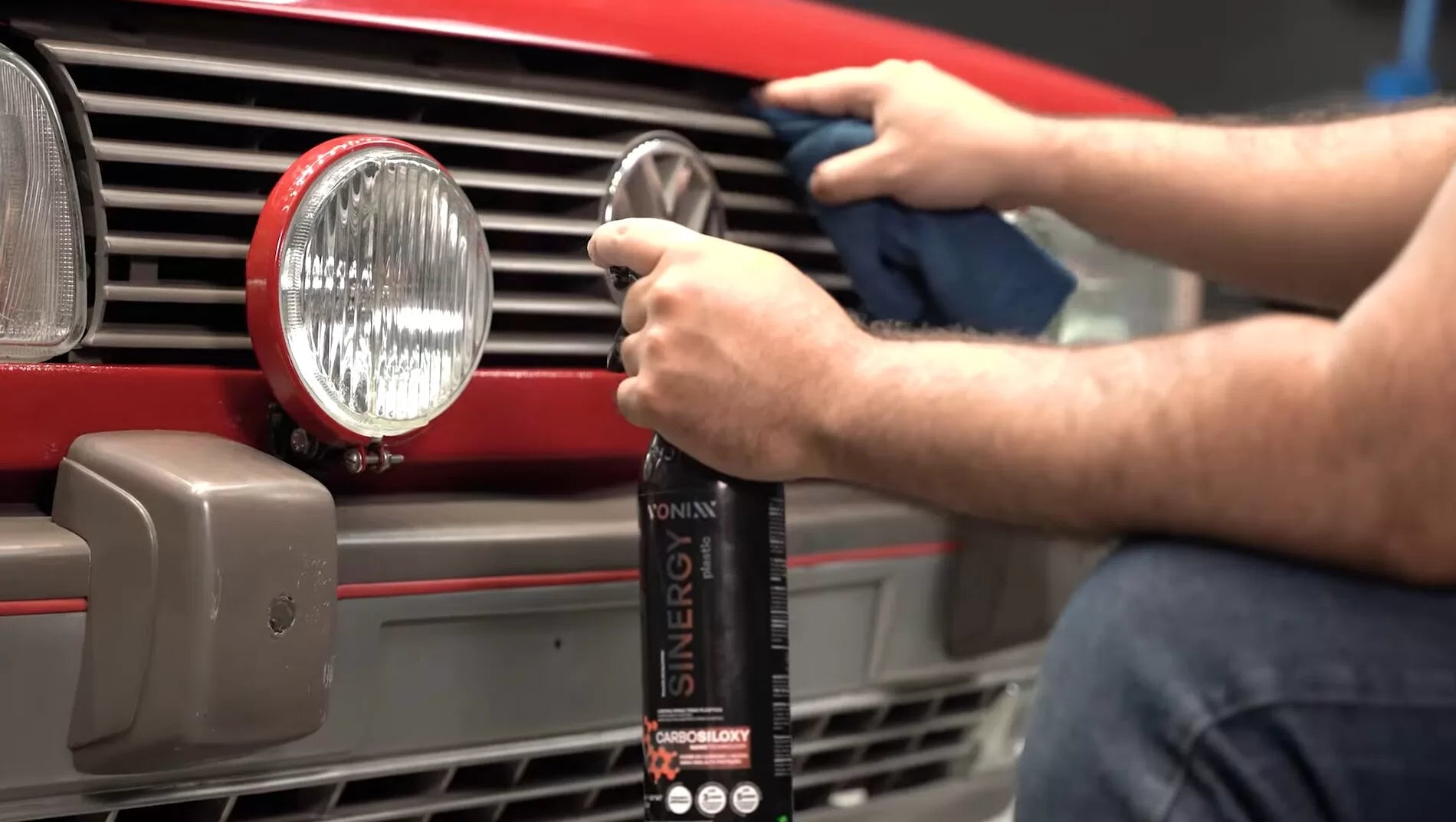 SINERGY PLASTIC es un protector a base de agua que contiene carbono y silicio actuando en sinergia para brindar protección hasta por tres años en los plásticos interiores y cinco meses en los plásticos exteriores del vehículo.